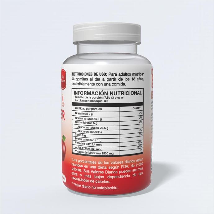 - Ingredientes activos: Vinagre de manzana, ácido fólico y vitamina B12.