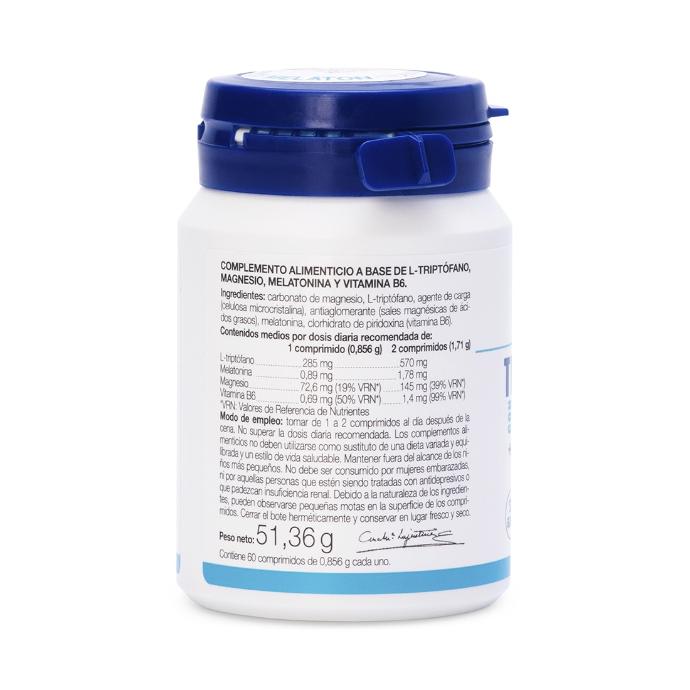 Es una combinación ideal para el descanso puesto que no solo es una fuente de aporte directo de melatonina exógena, sino que además al combinarlo con el triptófano, el magnesio y la vitamina B6 se estimula la síntesis de serotonina y melatonina endógena. Además, la melatonina también estimula la producción de la hormona del crecimiento, tiene propiedades antioxidantes y neuro protectoras. Mejora la calidad del sueño y refuerza el sistema inmunológico. La combinación con triptófano ayuda a la producción de ésta dentro del cuerpo.