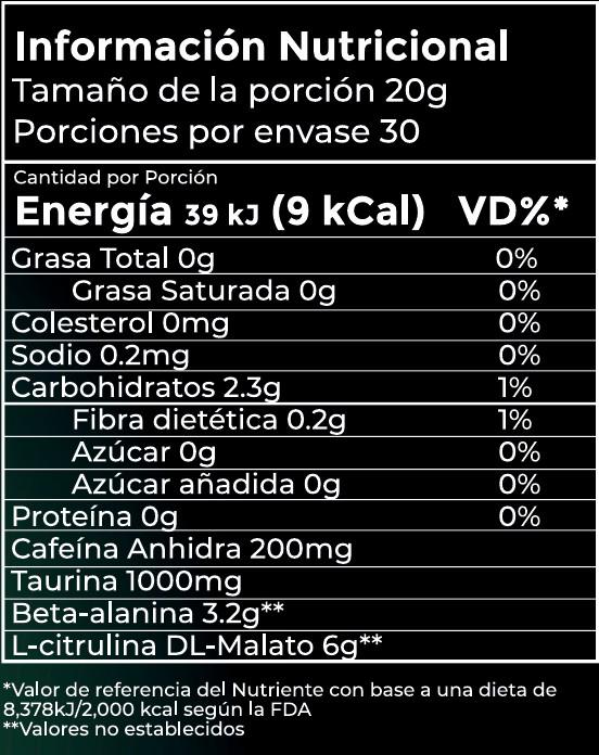 – Agrega 1 – medidas a 6-8 onzas de agua fría. Consuma 20-30 minutos antes del entreno. Inicie con 1/2 medida para evaluar tolerancia.