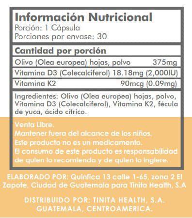 - Vitamina D3, Vitamina K2, hojas y polvo de olivo, fécula de yuca, ácido cítrico.